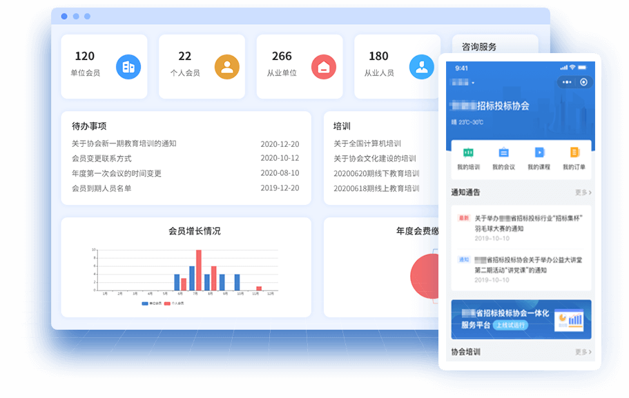 安訊協會一體化服務平臺,是按照“互聯網+社會組織”的理念,采用 “云計算、大數據”等先進信息技術,立足協會服務會員、規(guī)范市場秩序、開展行業(yè)自律等需求,建立的一體化管理與服務平臺,集成會員、從業(yè)人員、從業(yè)單位管理,通知、培訓、會議、咨詢、資源、直播服務,以及門戶網站、移動應用,實現協會各業(yè)務數字化整合,全面提升各方獲得感,為協會服務國家、社會、行業(yè)提供全面的信息化支撐。